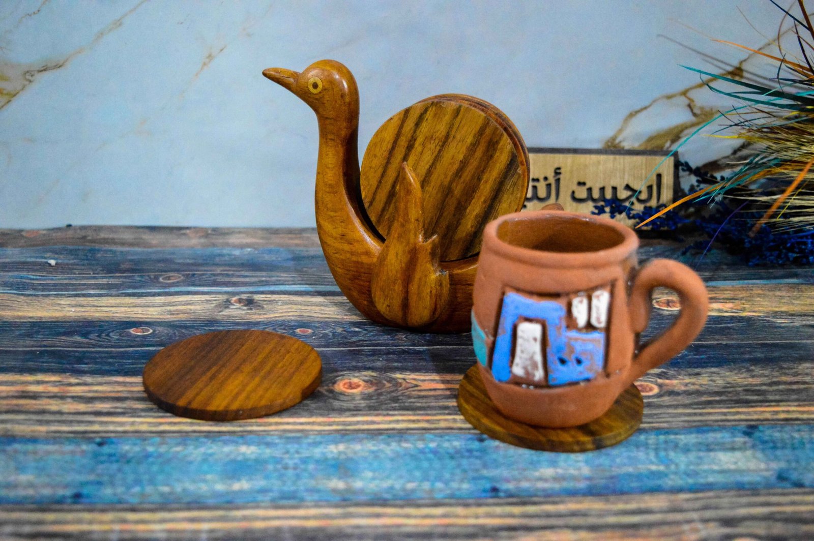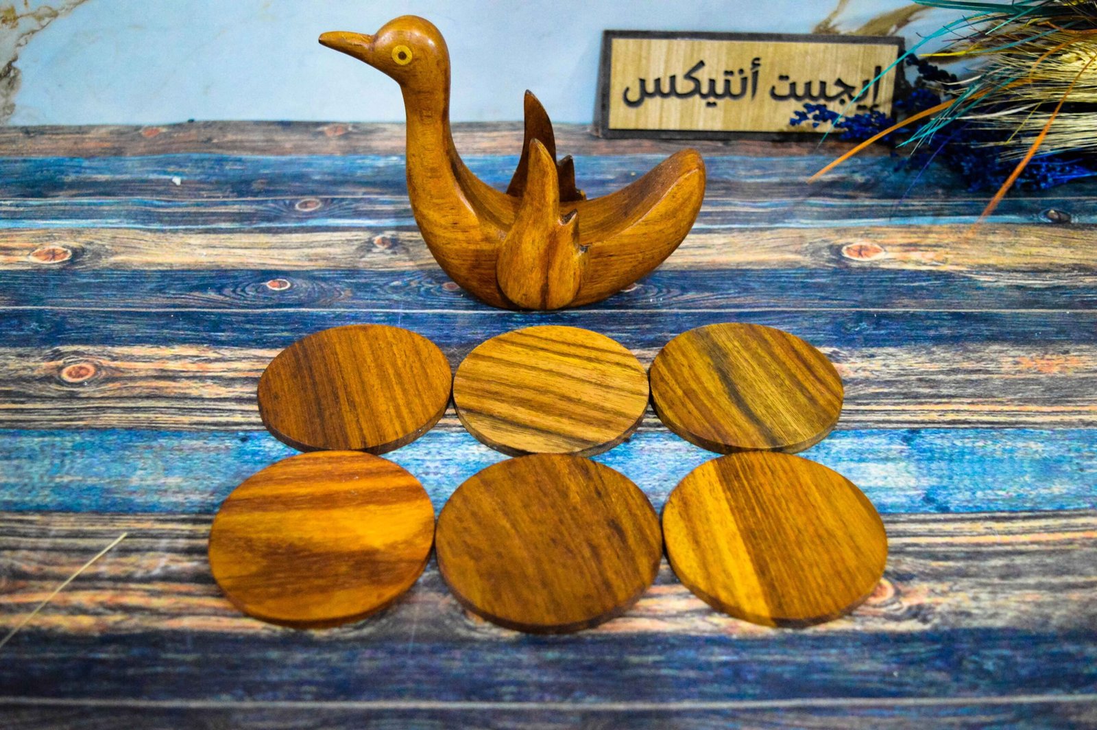 A handmade duck-shaped coaster set made from solid sycamore wood, 100% natural, produced by Egypt Antiques