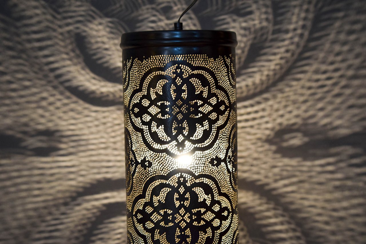 وحدة اضاءه شرقي مغربي معدني – نجفة معلقة – لمنتصف السقف شكل اسطواني للاستخدام الخارجي او الحديقة او للاستخدام الداخلي صناعة يدوية 100% انتاج ايجيبت انتيكس