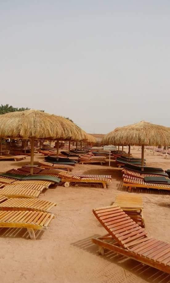 عرض اتنين شيزلونج بحر خشب زان احمر مع ترابيزة حديد 75 سم مع شمسية بحر انتاج ايجيبنت انتيكس